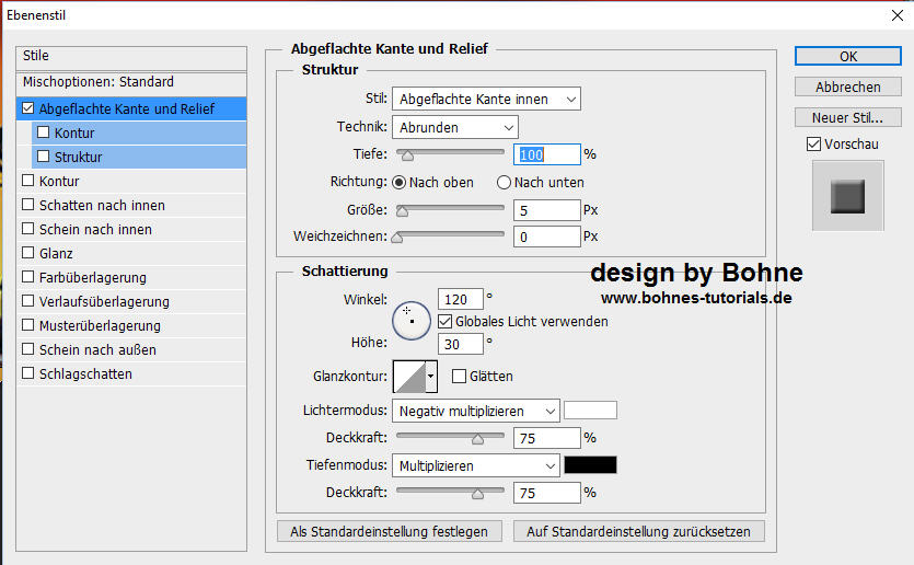 Ebenenstil hinzufügen -> Abgeflachte kante und Relief
