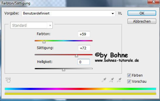 8) klick wieder das Maskier-Modus Symbol und Auswahl umkehren mit Umschalt+Strg+I und mit Strg+U den Farbton/Sättigung - Modus Aufrufen und stelle folgendes ein